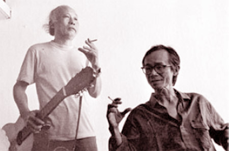 | Nhạc sĩ Hoàng Hiệp và nhạc sĩ Trịnh Công Sơn. Nói một tình yêu chân thành và thuỷ chung thành vạn tình yêu là như thế. Tình yêu đất nước, tình yêu Hà Nội và trọn vẹn một niềm tin cho một tình yêu với một người con gái Hà Nội để làm nên bài ca sống mãi trong lòng người. Một thời gian dài Đài Phát thanh và Truyền hình Hà Nội sáng nào cũng vang lên giai điệu khúc ca nay và ai mỗi khi thức giấc cũng đều nhẩm theo lời ca: “Dù có đi bốn phương trời, lòng vẫn nhớ về Hà Nội. Hà Nội của ta, thủ đô yêu dấu một thời đạn bom, một thời hoà bình. Nhớ…”. Chính vì lẽ đó, mà nhiều lần trong lúc mê man trên giường bệnh, ông vẫn chỉ gọi tên vợ ông, người con gái Hà Nội xưa, luôn túc trực bên cạnh bón từng thìa cháo cho chồng. Hình ảnh bà Diễn Lan ân cần chăm sóc ông và hướng dẫn cho ông cách điều khiển chiếc xe lăn mỗi khi ông lúng túng đã trở nên quen thuộc và làm ấm áp lòng người; gợi cho ta bao nỗi niềm sâu thẳm về tình yêu. Ca khúc phải thuộc về cuộc sống Kho tàng âm nhạc của Hoàng Hiệp khá đồ sộ. Nếu không kể các tác phẩm khí nhạc, nhạc cho hàng chục bộ phim thì ông có tới 400 ca khúc tạo được một phong cách lãng mạn cách mạng sâu sắc. Điều nổi bật trong ca khúc của ông là dấu ấn của âm hưởng dân gian hiện đại. Có thể nói ông là người mở đầu cho phong cách này mà hiện nay nhiều nhạc sĩ trẻ kế thừa, tiếp bước trên con đường tìm Bài hát Việt. Ông đã có nhận xét, kiểu viết nhạc “ăn xổi ở thì” sẽ khó có sức sống lâu bền. Âm nhạc cần bắt nguồn từ sự sống và trở về cuộc sống. Ông cũng đã có nhiều sách giáo khoa cho âm nhạc trong nhà trường và luôn đề cao ý tưởng đó. Tình yêu với quê hương, đất nước với những gian nan và khổ đau của dân tộc đã làm nên sự nghiệp âm nhạc Hoàng Hiệp. Và những tác phẩm của ông từ đó cũng thuộc về cuộc sống. Người ta nhớ cùng nỗi nhớ của ông. Người ta vui cùng niềm vui của ông và sự sẻ chia ấy tạo được sức sống bền vững qua tác phẩm. Đó là những giai điệu bất tử đối với sự nghiệp âm nhạc cách mạng và đầy lãng mạn của người con miền Nam đối với Tổ quốc thân yêu. |