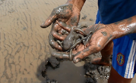 Miệng hang tua tủa vết bùn đùn, ông Nguyễn Văn Chín Hai (53 tuổi, ngụ xã Tân Thành, huyện Gò Công Đông) dùng chân đạp một ngách hang khiến nước ở các ngách còn lại bắn lên tung tóe. Tiếp đó, ông dùng đôi tay săn chắc của mình bới móc lớp cát rồi lôi lên một con mực với những chiếc tua dài thườn thượt. Con mực màu xám xịt được dúi qua cái lỗ nhỏ của chiếc nắp nằm gọn trong thùng. Ông Hai tiếp tục rảo bước, mắt nhìn đăm đăm về phía trước dò tìm hang mực. Trời đã quá 10 giờ, thủy triều đang rút rất nhanh. Chẳng mấy chốc, phía trước chúng tôi là bãi cát đen trải dài mút mắt với những vũng nước loang lổ và vỏ của các loài 2 mảnh. Nước rút tới đâu ông Hai cùng những người trong nhóm theo ra tới đó. Chúng tôi không còn nhớ nổi mình đã tới lui bao nhiêu bận trên bãi cát này. Đằng xa, thấp thoáng dáng của những người cào nghêu lặng lẽ với hành trình mưu sinh ở xứ cát đen biển bùn.