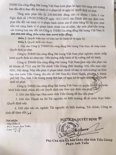 Theo đó, doanh nghiệp này bị phạt hành chính 480 triệu đồng do vi phạm Luật Bảo vệ môi trường như: Bố trí lưu giữ tạm thời chất thải nguy hại không đảm bảo yêu cầu kỹ thuật và để xảy ra sự cố tràn đổ chất nguy hại ra môi trường xung quanh.