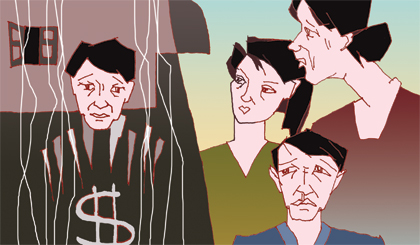 Đau hơn nữa là anh đã giới thiệu nhiều người khác “làm ăn” với hắn, họ cũng bị mất nhiều tiền. Bây giờ thì gia đình anh bị nợ nần vây tứ giăng, đứa con anh buộc phải bỏ học về quê, còn anh thì phải vào tù. Lâu lâu, anh quay ra phía sau nói chuyện với vợ, vẻ ốm yếu, gương mặt xanh xao, khoát một chiếc áo ấm cũ màu hồng nhạt đã bạc màu.