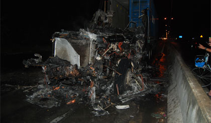 tài xế, lưu thông, trung lương, ngã tư, văng bánh, xe đầu kéo, cháy rụi