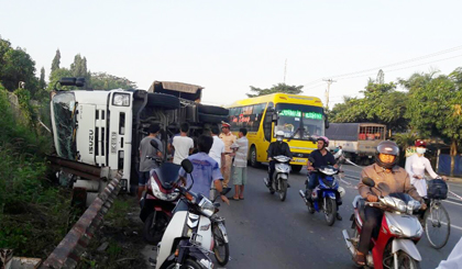 Khi đến đoạn thuộc địa bàn xã An Thái Đông, huyện Cái Bè, thì bất ngờ quay đầu vào lề phải để tránh một phương tiện ngược chiều lấn đường. Do thắng gấp nên xe tải bị lật ngang trên lề đường.