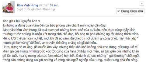 Lẽ ra, Hưng sẽ im lặng, đã muốn làm vậy, nhưng thật khó. Khó không phải cho Hưng, vì Hưng, mà vì khán giả của Hưng. Những bức xúc tột cùng của fans ở khắp mọi miền, sự tức giận của những khán giả lớn tuổi, hoang mang của các fans nhí… và hơn hết, là danh dự của những ‘giải thưởng’ chất ngất trong căn phòng đang lưu giữ những vẻ vang của nghề nghiệp của Hưng, buộc Hưng phải lên tiếng.