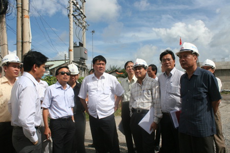 | Bộ trưởng Bộ GTVT Đinh La Thăng kiểm tra xây dựng cầu Chợ Gạo vào ngày 20-7. Ảnh: P.T |