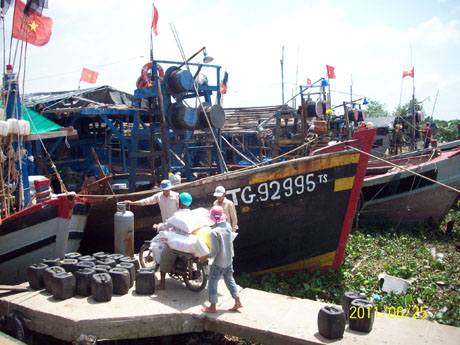 | Tàu cá ngư dân Gò Công chuẩn bị hậu cần ra khơi. |