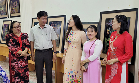 (đứng thứ 2 từ trái sang) trao đổi cùng các tác giả Chủ tịch hội Văn học nghệ thuật tỉnh Tiền Giang, ông Nguyễn Huỳnh Anh chúc mừng và đánh giá cao chất lượng các tác phẩm tham gia triển lãm. Ông mong muốn các học viên tiếp tục đầu tư sáng tác, tích cực tham gia các phong trào mỹ thuật ở Tiền Giang trong thời gian tới.