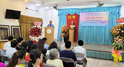 Tham dự có Nghệ nhân ưu tú, soạn giả Nguyễn Huỳnh Anh - Chủ tịch hội Văn học nghệ thuật tỉnh cùng đông đảo các hội viên Chi hội Mỹ thuật Tiền Giang và học viên khoá học.