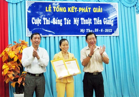 | Ông Nguyễn Ngọc Minh (Giám đốc Sở VH-TT-DL) và ông Nguyễn Huỳnh Anh (Chủ tịch Hội VH-NT tỉnh) trao giải Nhất cho tác giả Ngọc Lành. |