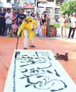 | Nghệ nhân trẻ Nguyễn Ngọc Thiện (bút danh Thiên Hoa) đang thủ bút. |