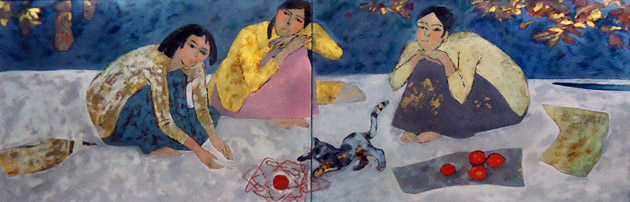 Cô gái và ba con mèo - sơn mài NTQT