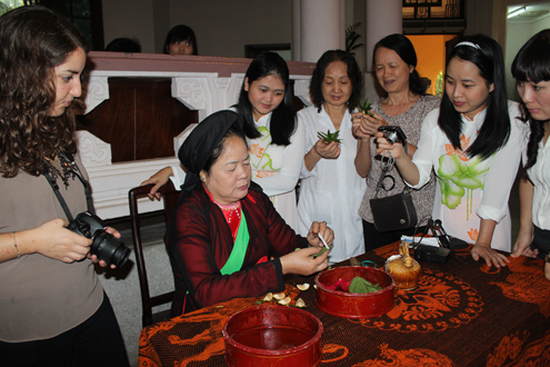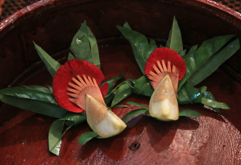 Cách têm trầu cũng thể hiện sự cầu kỳ, tinh tế. Tùy từng hoàn cảnh mà trầu được têm theo mỗi cách khác nhau với ý nghĩa biểu trưng khác nhau: Trầu cánh phượng, cánh kiến, cánh quế, mũi mác. Trong ảnh, nghệ nhân Vũ Thị Tuyết Lan (61 tuổi, ở Bắc Ninh) đang têm trầu cánh phượng mời các vị khách tới thăm triển lãm.