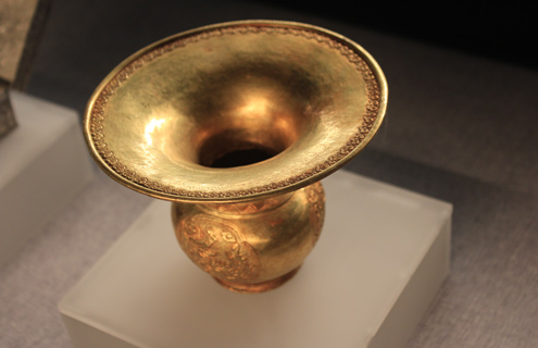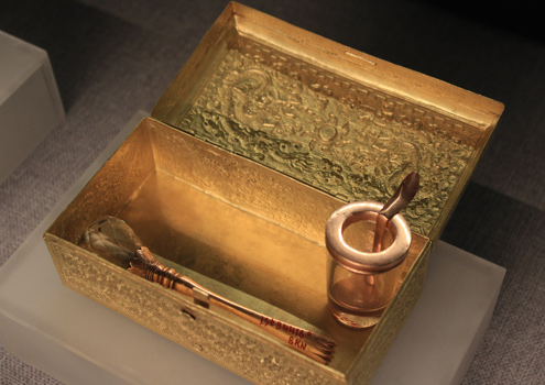 Ống nhổ trạm nổi hình rồng bằng vàng thời Nguyễn dùng để nhổ bỏ nước trầu, bã trầu.