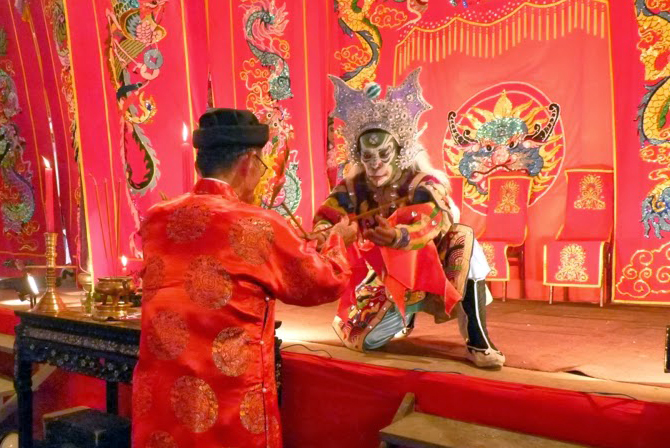 1 nam, 1 nữ đảm nhận. Nam diễn viên đóng vai Thái Dương Thiên Tử, mặt đỏ, râu bạc năm chòm, đội mão Cửu Long, áo bào đỏ, quần giáp, chân đi hia, tay cầm 1 cái chén có bịt vải đỏ, trong chén bỏ vài đồng xu để khi múa lắc chén tạo tiếng kêu “leng keng” - Bịt vải đỏ tượng trưng cho mặt trời. Diễn viên nam ra múa những động tác quy định với ý nghĩa tạo ánh sáng, hơi ấm cho vũ trụ, sau đó lui vào trong.