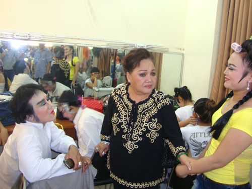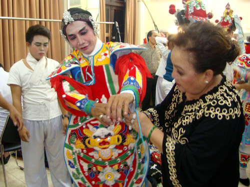 NSND Ngọc Giàu phụ mặc trang phục cho một diễn viên hát bội