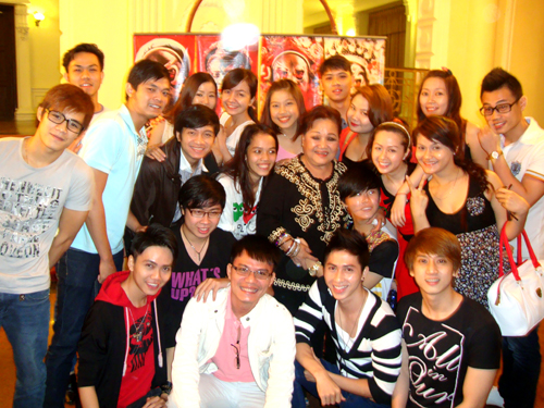 Các diễn viên trẻ chụp ảnh lưu niệm với NSND Ngọc Giàu