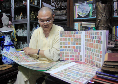 Đam mê sưu tập tem từ nhỏ, hòa thượng Thích Từ Nghiêm ở Đà Nẵng đã sở hữu hơn 10.000 con tem thuộc dạng khó kiếm, trong đó có hơn 30 tem xưa về vua Bảo Đại, hoàng hậu Nam Phương, hoàng tử Bảo Long...
