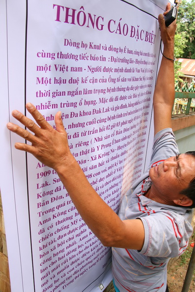 Gia đình Ama Kông dán thông báo về sự ra đi của vua săn voi huyền thoại - Ảnh: Tr.Tân