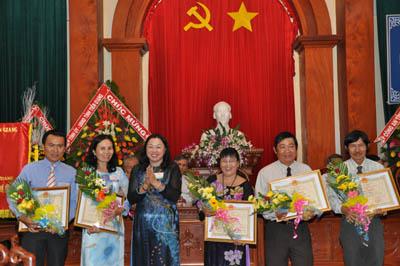 | Phó Chủ tịch UBND tỉnh Trần Kim Mai trao Bằng khen của UBND tỉnh cho 5 cá nhân xuất sắc. |