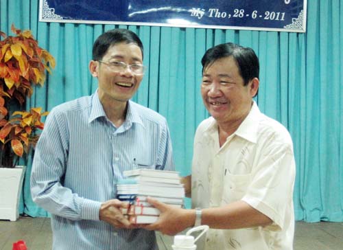 Soạn giả Huỳnh Anh - CT Hội VHNT Tiền Giang gửi tặng các ấn phẩm của Hội cho nhà thơ Mai Thìn
