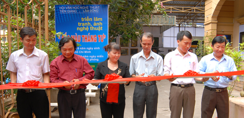 Lãnh đạo Hội VHNT Tiền Giang và Lâm Đồng cắt băng khai mạc triễn lãm. Ảnh: Sao Hôm