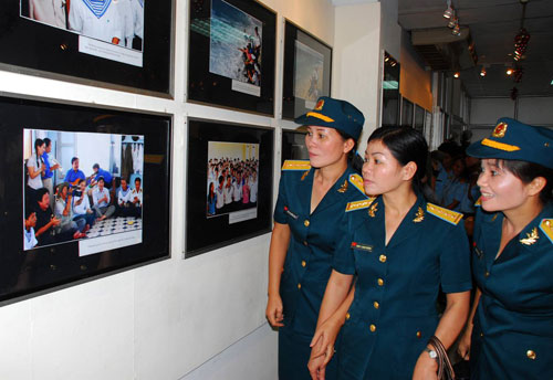 Các nữ chiến sĩ phòng không không quân đóng trên địa bàn TP.HCM xem triển lãm về những người lính biển - Ảnh: Hoàng T