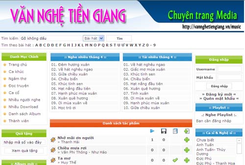 http://vannghetiengiang.vn/music. Đây là chuyên trang nghe nhìn với nhiều nội dung đa dạng như: nghe nhạc trực tuyến, nghe ngâm thơ, nghe đọc truyện, nghe các bài vọng cổ…