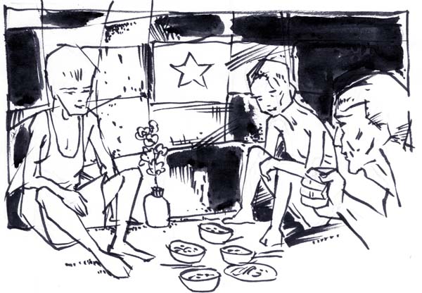 Để cưu mang ba con nhỏ, hai trai một gái, thiếu phụ mở hàng bánh canh bột lọc. Bốn cây nạng làm chân, một tấm ván làm bàn. Vài mươi cái tô, một cái trả bằng đất.