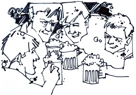 Bẵng đi bốn năm, quán bia khang trang hẳn lên. Những túp lều lợp lá dừa xé xuất hiện dưới các tàn nhãn cổ thụ. Hòn non, cây kiểng, hồ cá, cầu tre, thác nước nhân tạo làm cho khung cảnh trở nên thơ mộng. Mấy em tiếp viên mặc áo hai dây, váy ngắn, da trắng, môi son tạo sự hấp lực cho mấy ông khách. Đúng quán, đúng bia, đúng bạn thật rồi. Ba thầy trò, mà thực ra là ba thầy trở lại quán xưa. Giờ thì bia Tiger, hàu tươi - bù tạt, cá hồi hấp hành, cua rang muối. Đang cụng ly, thầy Khoa hỏi: