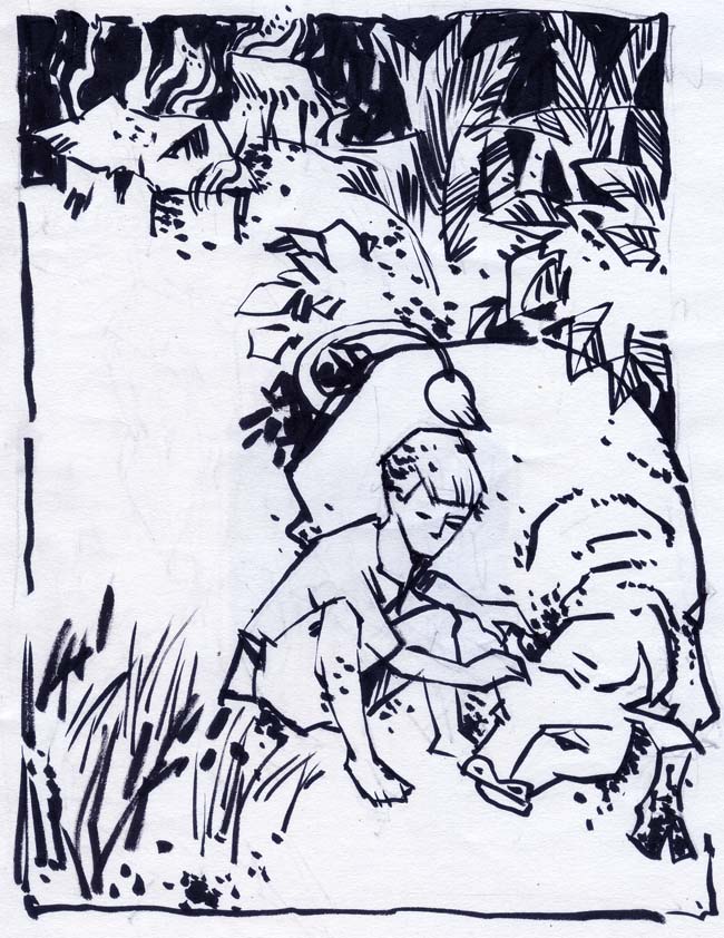 Cậu nó nhảy lên bờ ngồi sau bụi tre gai.