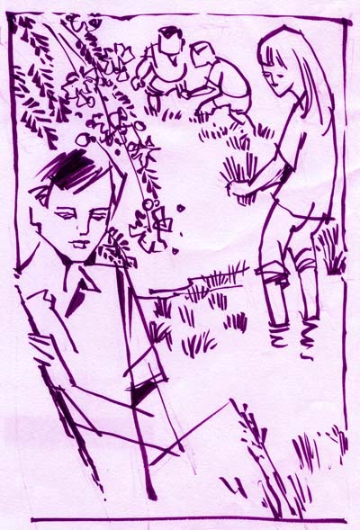 Chưa kịp cười thì Gương đã giãy lên khóc ngất. Một con đỉa to bằng ngón tay cái, xanh mun đang bám chặt vào bắp chân cô. Chính vội vàng bứt nắm cỏ vuột nó ra. Chỉ có chút xíu vậy thôi, mặt cô nàng xanh lét, thẫn thờ cả buổi.