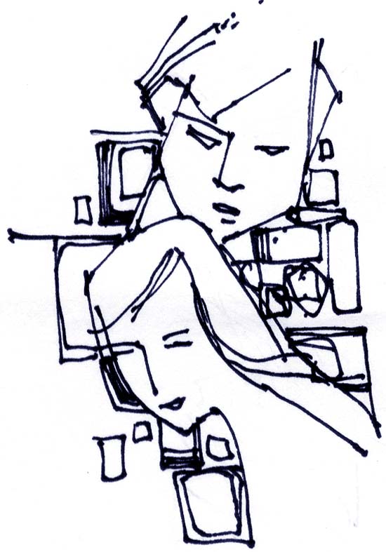 Lúc đôi nam nữ vào đến thì Nhi đã kịp dùng lược cào sơ mái tóc dài, rồi dùng thun buộc túm về sau gáy. Đã lâu Nhi không còn xõa tóc. Cô cảm thấy mình già. Người con trai nhìn Nhi từ sau vai cô gái. Cái nhìn của anh nhanh và ngắn, cơ hồ anh có nỗi băn khoăn!?