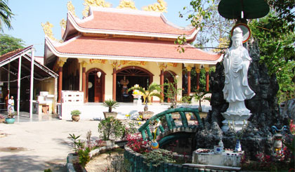 Trong sân chùa có tượng Phật Bà Quan Thế Âm đứng trên tòa sen cầm bình cam lồ và điện thờ Phật Di Lặc, xung quanh là vườn hoa và những cây sa la tạo không gian thanh tịch chốn thiền.