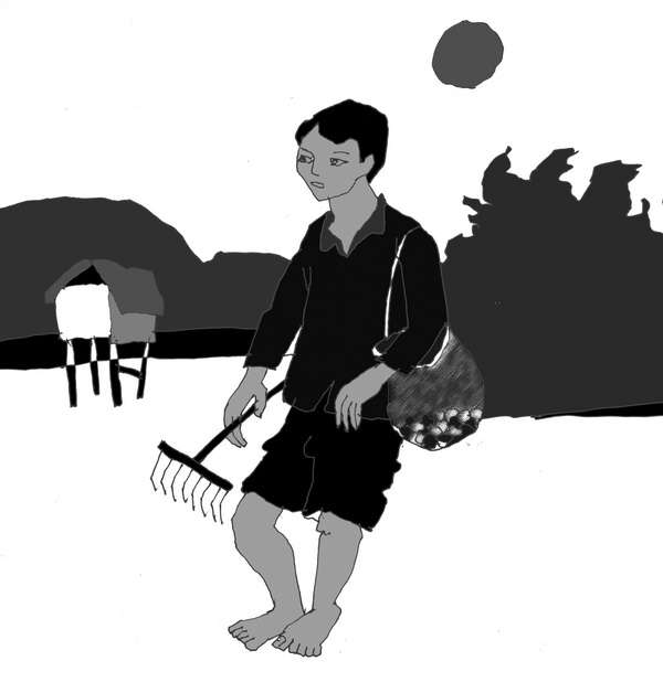 Vẫn không nói lời nào, nó bỏ cây cào nghêu vào túi và lầm lũi sải bước về hướng xóm nhà lá có ánh đèn dầu leo lét.