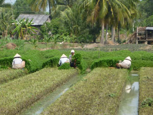 Đến khu vực xã Nhị Bình, huyện Châu Thành (tỉnh Tiền Giang), chúng tôi chứng kiến được cảnh thu hoạch rau diếp cá rất nhộn nhịp: người thì hối hả cắt rau, người thì nhặt rau lại rửa sạch để cân cho thương lái. Ngày nào cũng vậy, trên cánh đồng Nhị Bình tiếng cười nói giòn giã vì trúng mùa rau diếp cá.