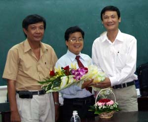 Hiệu Trưởng trường THPT Chuyên Tiền Giang Đặng Vũ Thanh (bên phải) tặng hoa chúc mừng nghiên cứu sinh Võ Phúc Châu