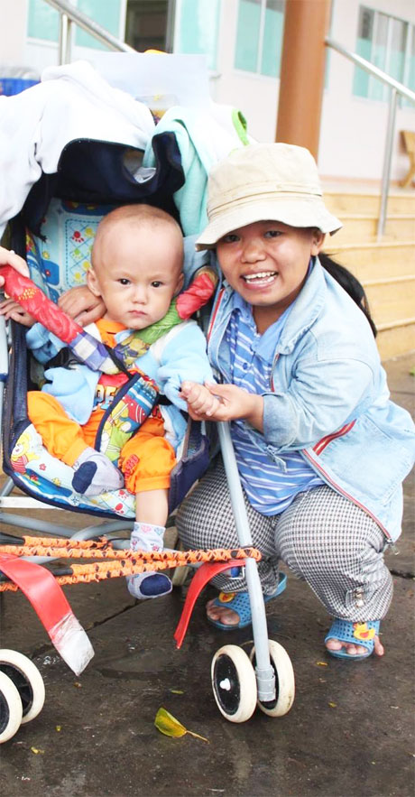 7 giờ sáng mỗi ngày, người mẹ lùn vất vả ẵm đứa con Trần Lê Minh Hiền (nay được 18 tháng tuổi) đặt vào xe đẩy để đi bán vé số.