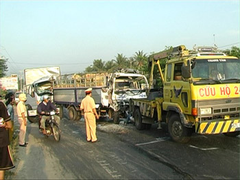 Đến thời gian và địa điểm trên, xe 69L-7167 đụng vào phía sau ôtô tải 66S-5563 đang lưu thông cùng chiều phía trước do Vũ Hồng Phước (SN 1972) ngụ TX. Sa Đéc, tỉnh Đồng Tháp điều khiển, chở trên xe là Nguyễn Tấn Hùng (SN 1973). Bị đụng từ phía sau nên xe 66S-5563 tông vào ôtô tải 77H-9925 đang dừng ở phía trước.
