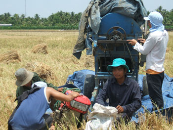 | Phạm Văn Dứt và các thành viên trong Tổ vần đổi công ấp Tân Hiệp thu hoạch lúa cho nông dân. |