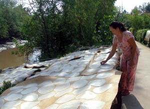 Ngày Tết ở quê, bánh phồng là món bánh giản dị để nhâm nhi và biếu bà con xa gần. Trong không khí sum vầy của những đầu năm, ngồi quây quần bên bếp lửa hồng, cời than ra nướng và thưởng thức từng cái bánh thơm giòn, kêu rôm rốp để nhớ mãi hương vị quê nhà được chế biến từ đôi bàn tay khéo léo của những người thợ chịu thương, chịu khó...