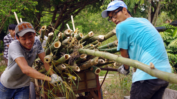 Chỉ tiêu của nhóm lột mít là phải làm xong bảy quả mít trong ngày. Còn nhóm các bạn nam vận chuyển tre đến khu làm than đang hì hục chất gần trăm thân tre dài lên xe đẩy. Mồ hôi nhễ nhại, Trần Nguyễn Thái Minh Tuấn (sinh viên Trường đại học Bách khoa) thở dốc: "Mệt ghê luôn!". Nhưng ai cũng vui.