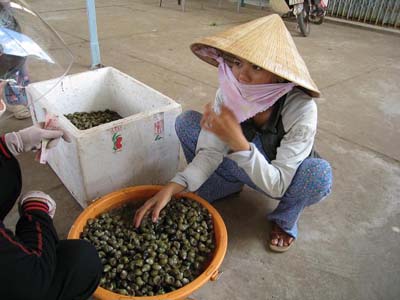 Vâng! Công việc mò ốc gạo, đãi ốc gạo là vất vả, là khó khăn…lại thường bị chủ rọ chê bai ốc non, ốc nhỏ để ép giá. Họ sẽ lựa ra loại ốc lớn thì đem ra chợ bán đổi gạo nuôi thân, ốc nhỏ thì sang lại cho chủ rọ đem về đổ trở xuống rọ của mình mà nuôi, để thu hoạch dần sau đó. Có rọ được nuôi với độ dày của ốc gạo, trong bùn và trên mặt đất hàng 50cm.