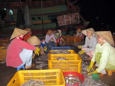 Bốn ngày nay, biển êm nên tàu về. Có cá nhiều. Chị em thức thâu đêm để phân loại cá. Các chị cho biết: Hôm nay mình đã làm từ sau 2 giờ khuya tới giờ. Tôi nhìn đồng hồ hơn 11 giờ trưa, người nhà lần lượt mang cơm ra, một số chị nhà gần vội vã đi về.
