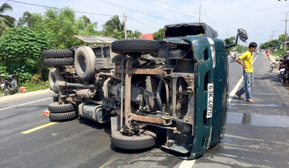 Trưa 25-10, trên Quốc lộ 50 (ấp Bình Tây, xã Thạnh Nhựt, huyện Gò Công Tây), xe tải tránh mô tô lật ngang trên đường.