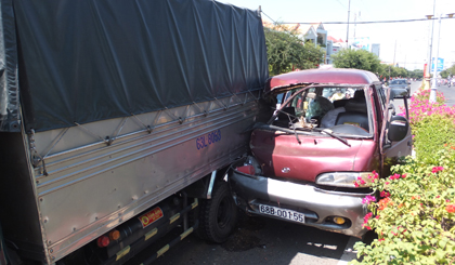 Khoảng 11 giờ 20 phút ngày 25-1, xe khách 68B-001.55 chở đầy trái cây, lưu thông trên đường Ấp Bắc (đoạn thuộc phường 10, TP. Mỹ Tho) hướng từ Trung Lương vào nội ô TP. Mỹ Tho, đã “húc” vào đuôi xe tải 63L-8053 đang chạy phía trước, làm đầu xe khách bẹp dúm một bên, ghim chặt vào đuôi xe tải.