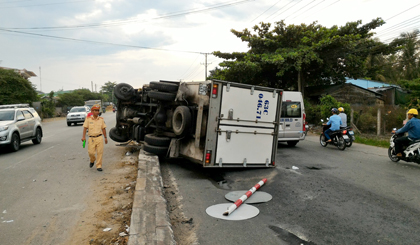 Khi đến đoạn điểm mở dải phân cách đoạn thuộc xã Đông Hòa, huyện Châu Thành thì tài xế đánh lái tránh xe mô tô không may xe tải tông sập biển báo sau đó leo lên dải phân cách lật nhào. Rất may tài xế chỉ bị xây xát nhẹ, xe tải bị vỡ kính chắn gió nằm vắt ngang dải phân cách hư hỏng nặng, dầu nhớt chảy tràn ra đường.