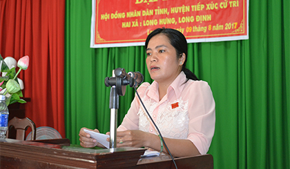 | Đại biểu HĐND tỉnh Nguyễn Thị Kim Nhung trả lời ý kiến cử tri tại buổi tiếp xúc cử tri. |