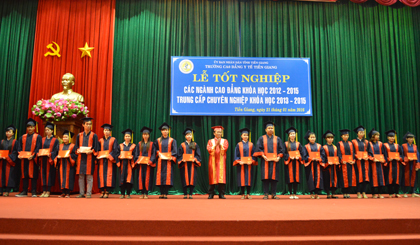 Trường Cao đẳng Y tế Tiền Giang vừa tổ chức Lễ trao Bằng tốt nghiệp cho 916/1.096 học sinh, sinh viên (HS-SV) các ngành Cao đẳng (khóa học 2012 - 2015) và Trung cấp chuyên nghiệp (khóa học 2013 - 2015), chiếm 46,72% HS-SV tốt nghiệp loại giỏi và khá.