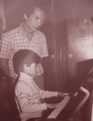 | NS Thế Song luyện đàn cho cậu con trai út sau này là NS Thế Hiển |