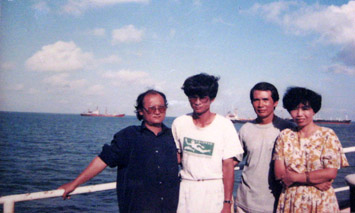 | NS Thế Song (thứ hai từ phải qua) trong lần đầu ra đảo Trường Sa cùng nhạc sỹ Lương Nguyên (trái). Ảnh: Đại đoàn kết. |