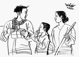 Cậu mợ không biết rằng ra khỏi xóm làng rồi, vẻ đẹp ấy trở nên lạc lõng, bơ vơ. Chị dâu cậu thường càm ràm, đã nói đem bánh trái ra chi mắc công, có ai ăn đâu… Cậu hiền lắm, nói mười hiểu hai, cười cười, cúng ba má mà đi tay không, coi sao được chị.